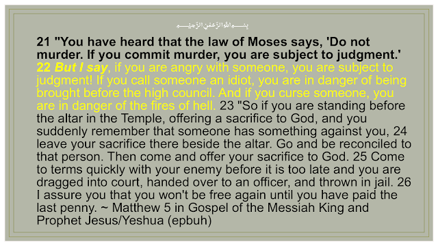 Allah (swt) has indicated in the Gospel and Quran some Laws to Preserve our Sacred Rights to Faith in Him and Worship of Him (swt). Because God does wish to Preserve Faith in Him and Worship of Him (swt). That we as humans and those of the Jinns do not have the right to through hate (anger); intellectual superiority, insult and slander (idiot); nor cursing another of Faith and innocence; cause the loss of Faith and Worship in God (all 3 of those being very destructive to their Faith and lives) as in Gospel Matt 5:21-26. Nor to directly oppose another person's right to Faith and Worship of God as in HQ 96:9-19. Nor in Matt 18:6 deliberately cause someone to lose Faith and Worship in God.